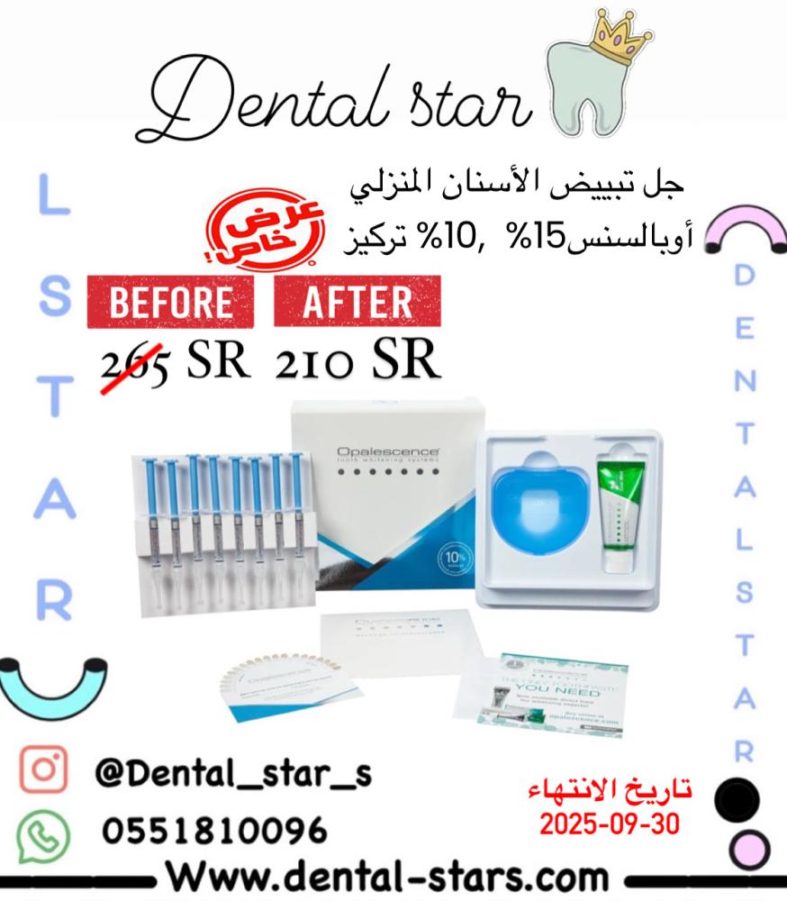 - opalescence جل تبييض الاسنان بتركيز 10% ,15% يحتوي على مادة ببيروكسيد الكارباميد الذي يضمن لك ابتسامة ناصعة البياض وبأسرع طريقة وأكثرها آمانًا